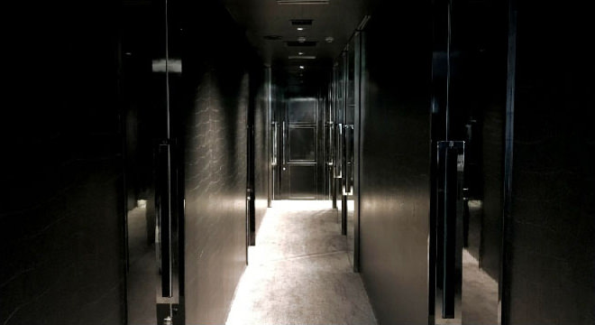 高鳴りと静寂が同居する、黒を基調としたコリドー。RBNのエントランスからトリートメントルームへと、優美につなぎます。