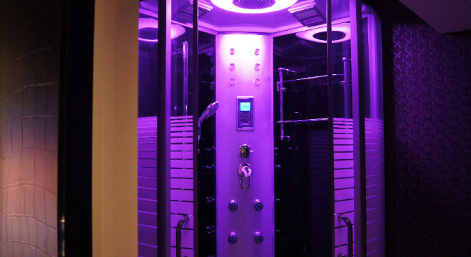 シャワールームにもクロモテラピーを採用。光と水による妖艶な近未来空間をお楽しみください。